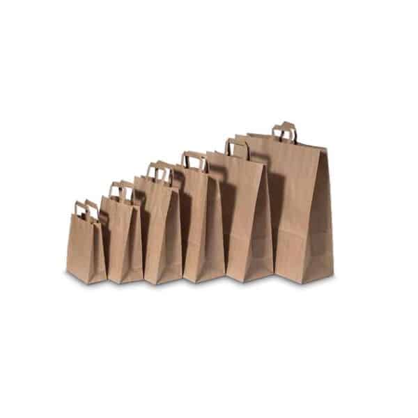 Bosses de paper amb nansa plana – bosses kraft marró llis de 50 g/m², disponibles en vuit dimensions estàndard (18 × 8 × 22 cm fins a 45 × 17 × 48 cm). Solució lleugera, resistent i 100 % reciclable per a comerç, restauració i serveis “take away”.